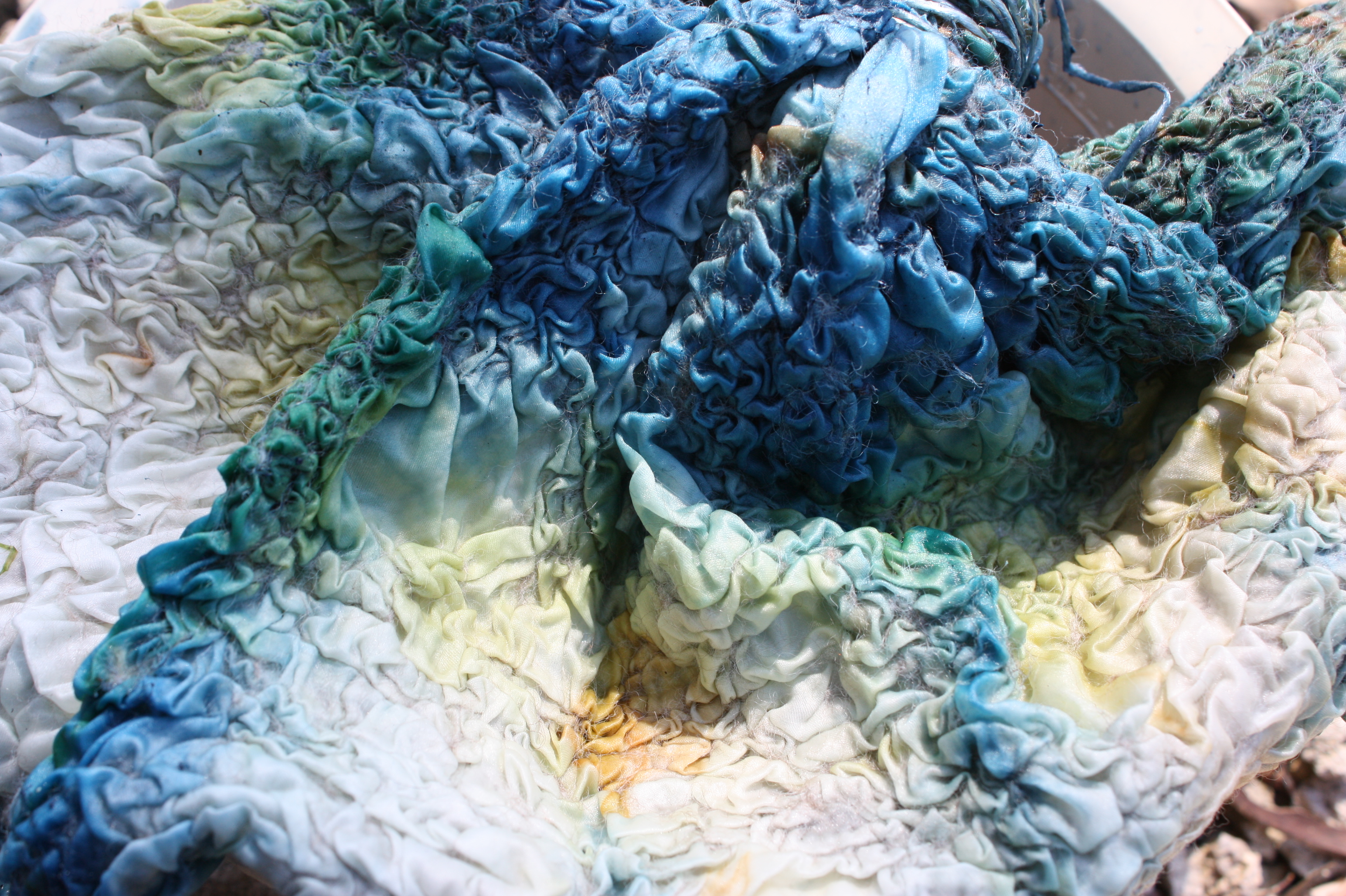 The eucaplyt eco print dyed on silk satin has then been felted and added to indigo.